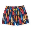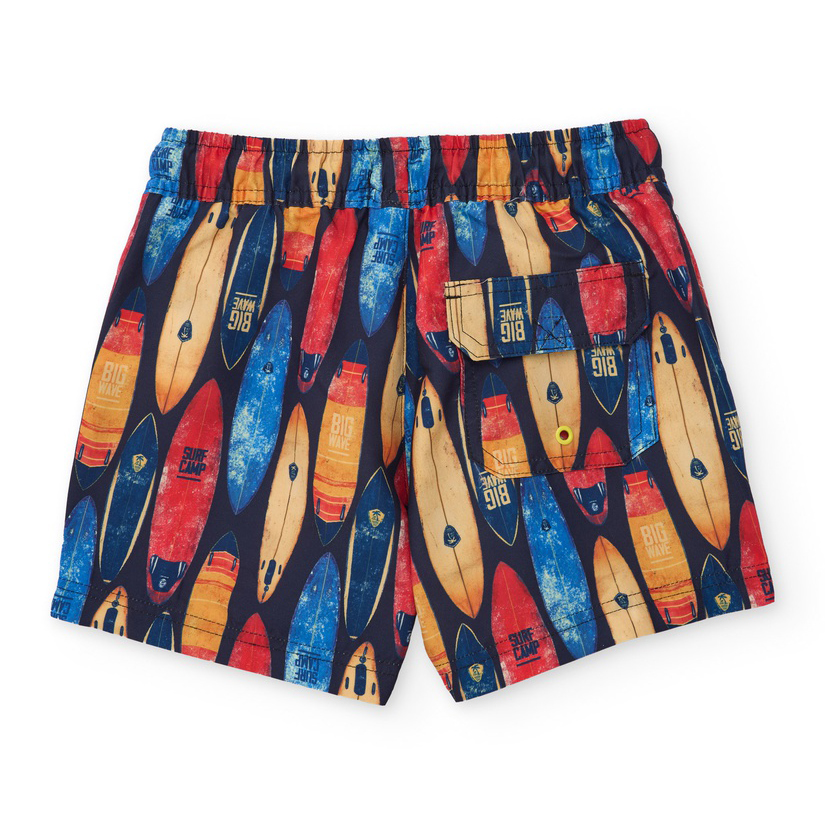 Costume da bagno per bambino in blu navy, realizzato in un tessuto leggero e a rapida asciugatura, ideale per la spiaggia e la piscina. È caratterizzato da una stampa ricca di tavole da surf dai colori vivaci, che dona un look estivo e dinamico. La vita elastica è dotata di laccetto regolabile in giallo per garantire maggiore comodità e una vestibilità stabile. Un capo pratico e divertente per godersi l’acqua in totale libertà.