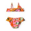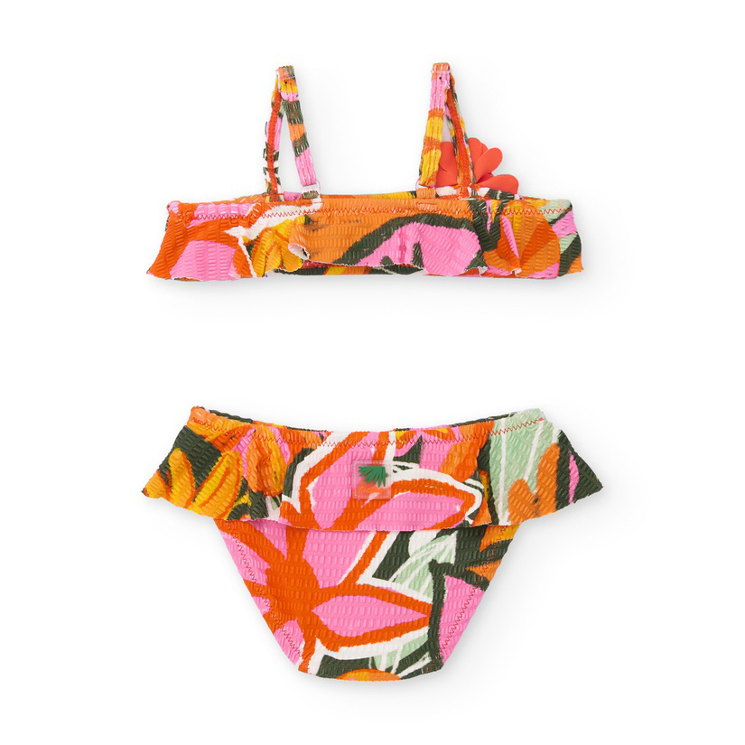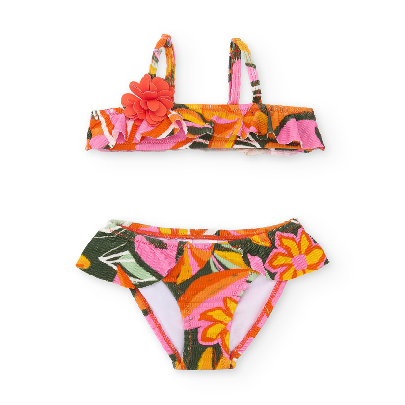 Bikini da bambina con fantasia multicolore, realizzato in un tessuto elastico e confortevole che garantisce libertà di movimento durante le giornate al mare o in piscina. La parte superiore presenta spalline sottili e un dettaglio floreale 3D su un lato, che aggiunge un tocco distintivo e estivo. Lo slip è rifinito con una piccola balza in vita per un effetto delicato e grazioso. Un completo fresco, vivace e perfetto per vivere l’estate con stile.