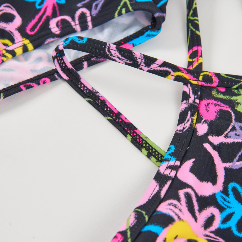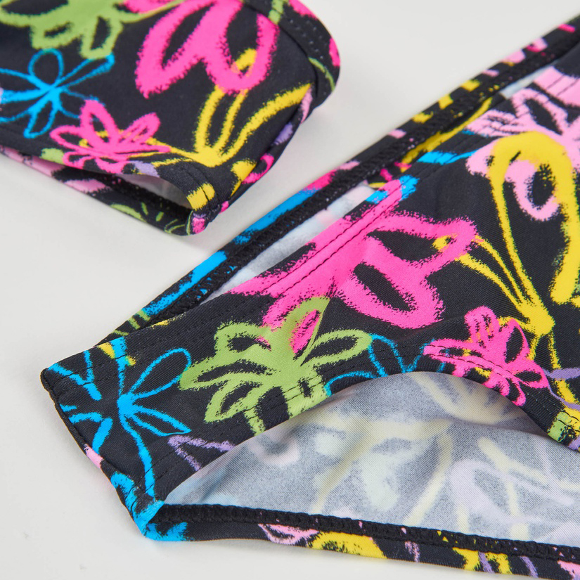 Bikini da bambina in nero, realizzato in un tessuto leggero e ad asciugatura rapida, ideale per il mare o la piscina. È decorato con una stampa multicolore in stile graffiti con fiori e tratti vivaci nei toni del rosa, blu, verde e giallo, che donano un aspetto dinamico e giovanile. La parte superiore presenta spalline sottili incrociate sulla schiena per una vestibilità comoda e stabile, mentre lo slip offre un sostegno piacevole senza stringere. Un completo fresco e ricco di personalità, perfetto per godersi l’acqua in comodità.