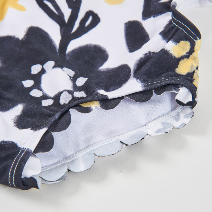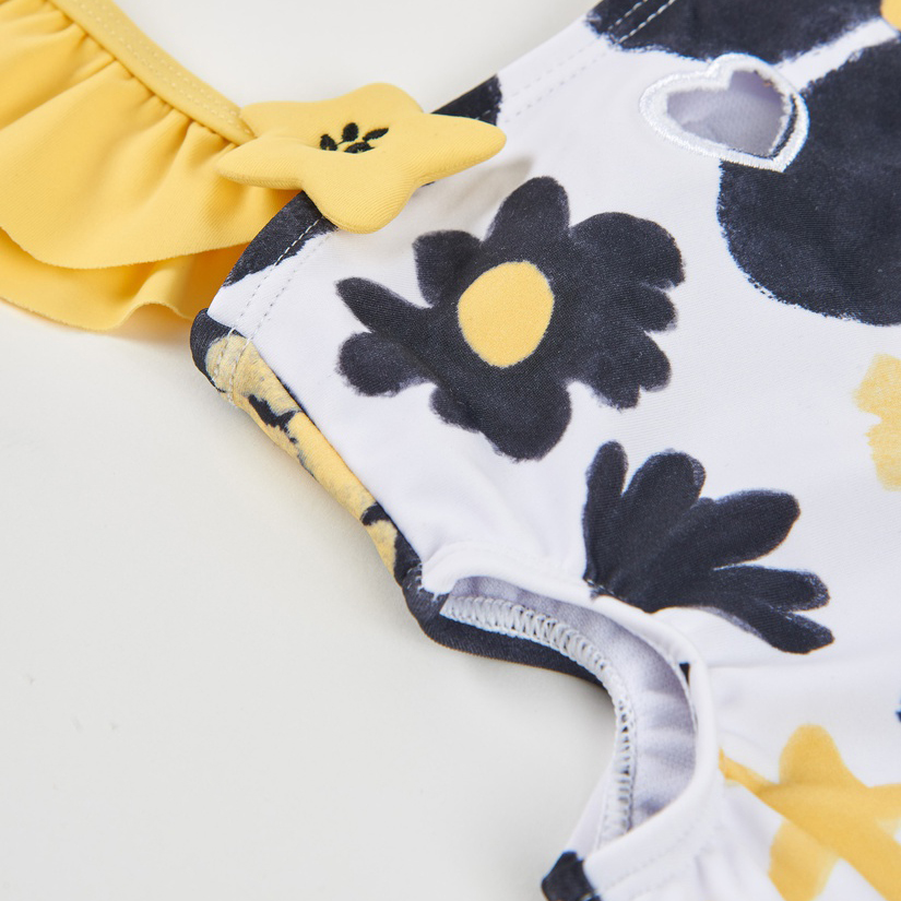 Costume da bagno da bambina in bianco, caratterizzato da una stampa floreale nei toni del nero e del giallo. Presenta un design asimmetrico con spalline diverse, una delle quali arricchita da un volant giallo e da una piccola applicazione a forma di stella che aggiunge un dettaglio distintivo. Le aperture laterali slanciano la linea, mentre i bordi ondulati creano un effetto molto originale. Il tessuto è morbido ed elastico, pensato per garantire comfort durante il bagno e il gioco. Un capo moderno e di grande impatto per le giornate di sole.