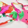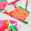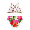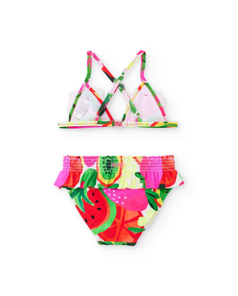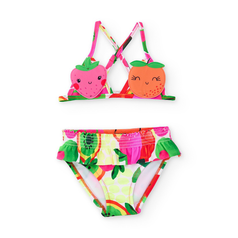 Bikini da bambina in tonalità multicolore, realizzato in un tessuto leggero e a rapida asciugatura, perfetto per le giornate al mare o in piscina. Il top presenta spalline sottili incrociate sulla schiena per una migliore vestibilità ed è decorato con due applicazioni imbottite a forma di frutta con espressioni simpatiche, che donano un tocco originale e giocoso. Lo slip è rifinito con un volant morbido in vita che aggiunge movimento e un aspetto grazioso. Un completo comodo, allegro e ricco di colore per vivere l’acqua in piena libertà.