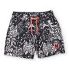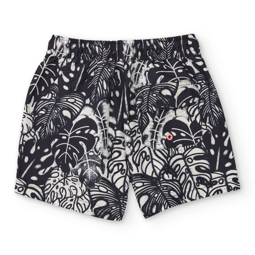Costume da bagno per bambino in nero con una vivace stampa di foglie tropicali in toni chiari che dona uno stile fresco ed estivo. La vita elastica è dotata di coulisse regolabile color corallo, che aggiunge un tocco di contrasto e assicura una vestibilità comoda. Presente anche una patch decorativa sulla gamba. Perfetto per giornate di mare e piscina.