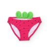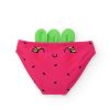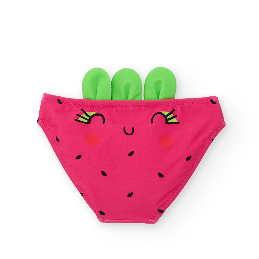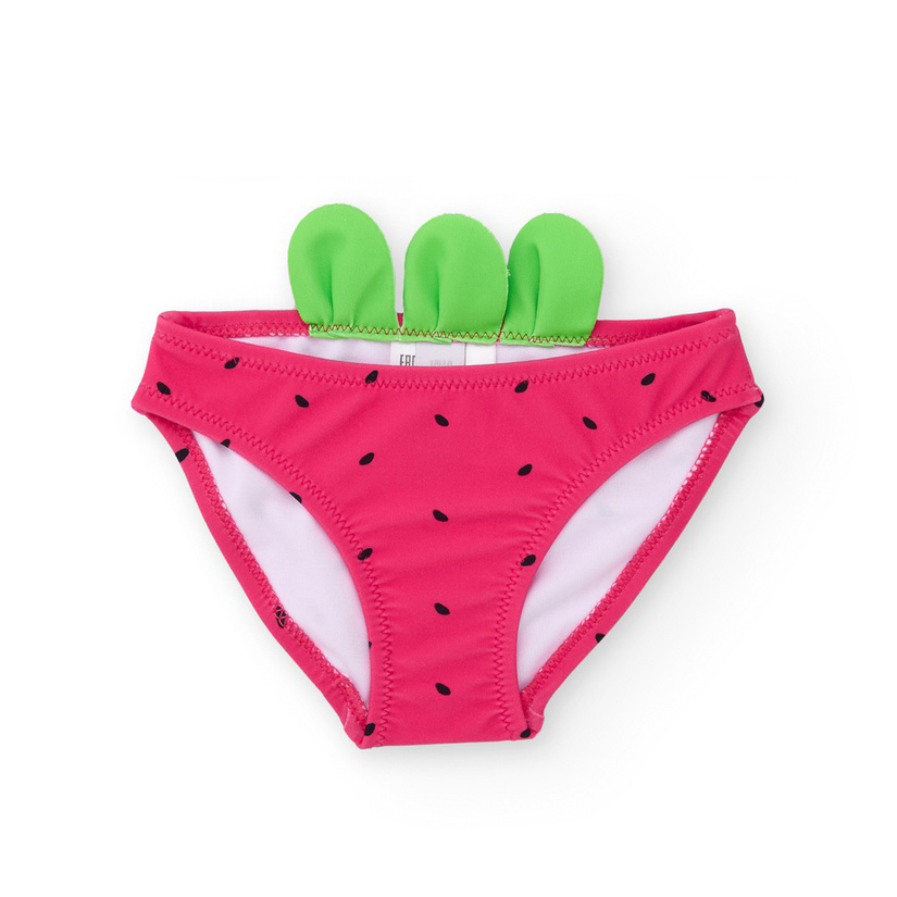 Slip da bagno per bambina di colore fucsia come tonalità principale, caratterizzato da una simpatica stampa di piccoli semi neri che richiamano l’aspetto di un’anguria. Nella parte superiore sono applicate tre sagome verdi a forma di foglia che aggiungono un tocco creativo e divertente. Il tessuto è morbido, elastico e adatto alle attività in acqua, garantendo una vestibilità confortevole durante i giochi in piscina o al mare.