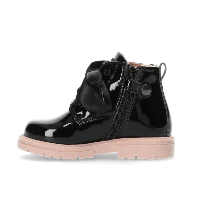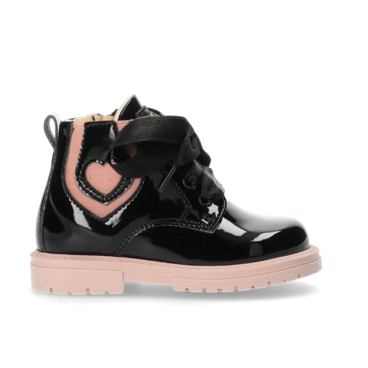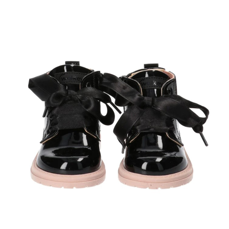 Stivaletti stringati da bambina Walkey in vernice lucida di colore nero. Lateralmente, in corrispondenza dell’elastico, un cuore rosa a contrasto. I lacci in raso donano eleganza alla scarpa. Internamente sono realizzati in pelle certificata Metal Free. La solettina estraibile è arricchita da estratti di Aloe Vera dalle note proprietà antibatteriche. La vestibilità è favorita dalla zip laterale. La morbidezza dei materiali selezionati da Walkey garantisce la massima libertà di movimento.