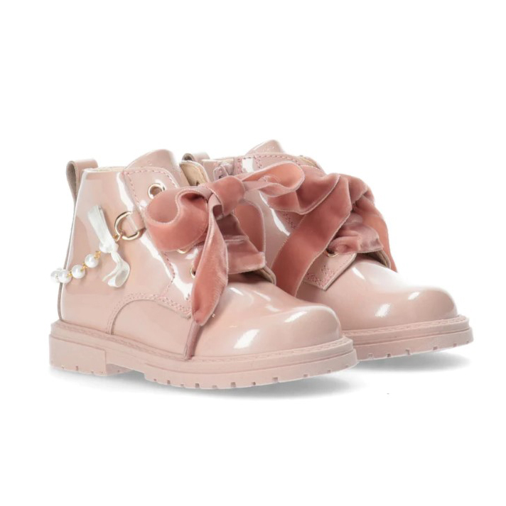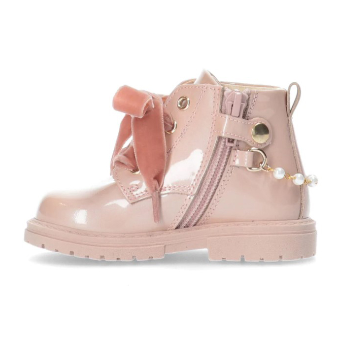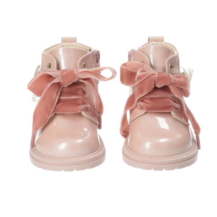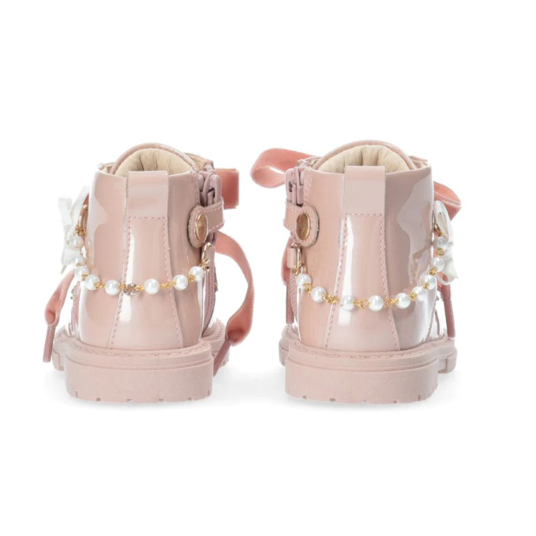 Stivaletti da bambina Walkey realizzati in vernice rosa lucida. Una catenina dorata di perle e i lacci in velluto donano eleganza alle scarpe. Internamente sono realizzati in pelle certificata Metal Free. La solettina estraibile è arricchita da estratti di Aloe Vera dalle note proprietà antibatteriche. La vestibilità è favorita dalla zip laterale. La morbidezza dei materiali selezionati da Walkey garantisce la massima libertà di movimento.